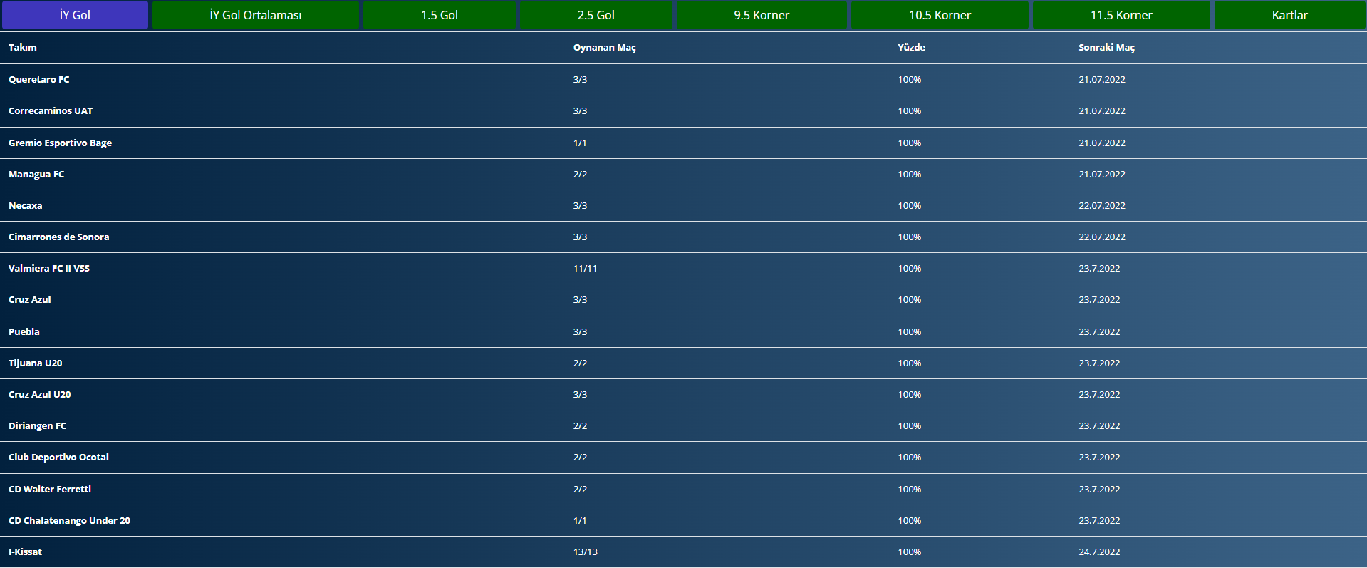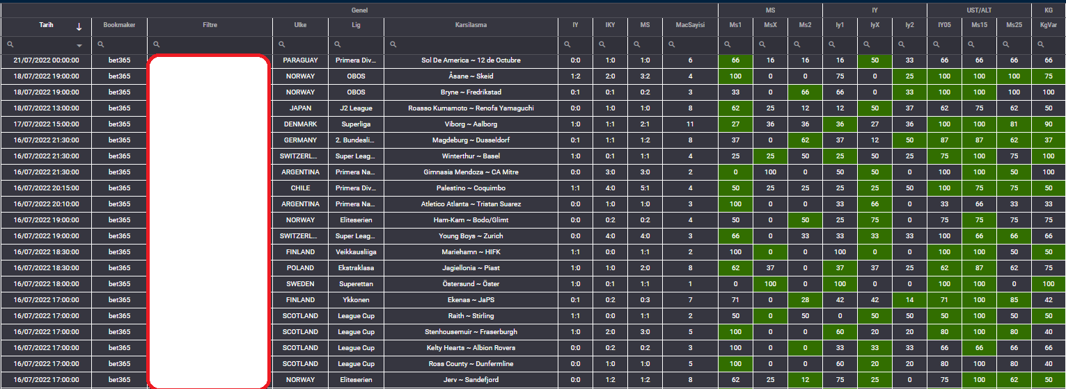 > Filtrenizi yaptınız ve filtre sonucunda 5 maç çıktı. % maçın 5 inde de en az 2 gol olduğunu gördünüz ve filtreyi kaydettiniz.