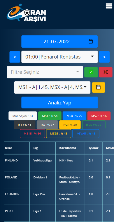 Maç isimlerinin bulunduğu yerdeki ileri geri butonları ile sonraki maça veya önceki maça filtrenizi uygulayarak hızlıca filtre sonucunuzu görebilirsiniz.